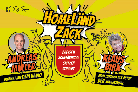 Ein Schwabe und ein Badener gemeinsam auf einer Bühne? Das klingt fast unmöglich. Aber die beiden kennen, schätzen und verstehen sich. Klaus Birk und Andreas Müller können die historisch zementierte Sprachbarriere zwischen Badisch und Schwäbisch überwinden. Der Schwabe Birk (Kabarett-Großmeister aus Tübingen) und der Badener Müller (Parodist und Radiocomedy-Star aus Baden-Baden) wollen das schier Unmögliche schaffen und zusammen auftreten: Ein Greif und ein Hirsch, vergleichbar mit dem Landeswappen. Mit ihrem neuen Programm „HomeLändZack“ werden sie erklären, dass die Welt nicht größer ist als THE LÄND, aber THE LÄND auch nicht kleiner ist als die Welt. Klingt paradox, ist es aber auch. Dabei wird sich zeigen, dass Aktualitätsbewältigung durchaus sinnstiftend ist und ein Blick zurück im Zorn sich nicht lohnt.